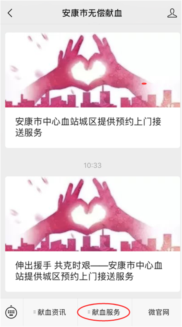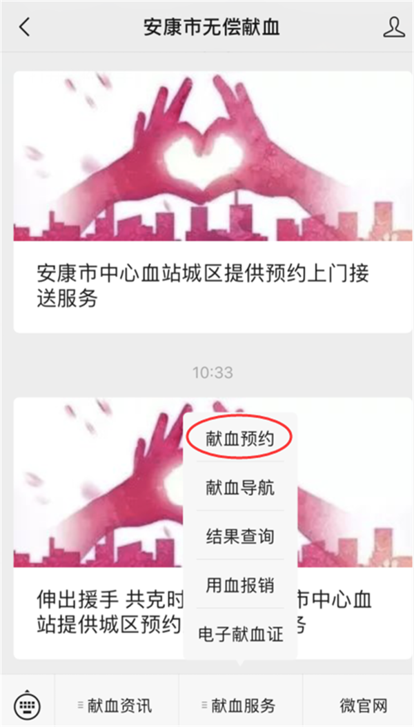 同時(shí)安康市中心血站公眾號(hào)開(kāi)放獻(xiàn)血預(yù)約渠道,(如圖示)在關(guān)注安康市無(wú)償獻(xiàn)血公眾號(hào)后,在最下方菜單欄選擇“獻(xiàn)血服務(wù)”——“獻(xiàn)血預(yù)約”——填寫相關(guān)信息,便可完成預(yù)約。