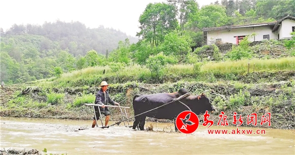 聽說要請他給我們講恒口貢米的故事,他煞有介事地愣了愣,說帶我們?nèi)ヌ镩g看看,再講。過了春分,耕種的土地上,我們感受到的是“農(nóng)家少閑月,五月人倍忙”的景象!在這里,沒有轟隆隆的機(jī)器聲,只用耕牛犁田,育苗平整,農(nóng)忙的身影在正暖的春陽與如織的細(xì)雨中穿梭。