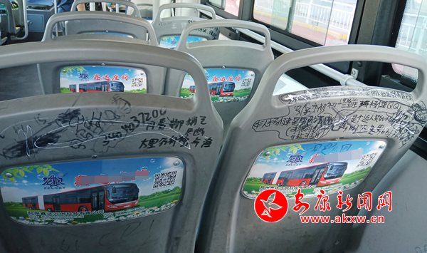 7月7日,筆者乘坐安康市城區(qū)7路公交車發(fā)現(xiàn),公交座椅靠背慘遭“涂鴉”,內(nèi)容不乏廣告標語、低俗粗鄙、不堪入目的語言,嚴重影響乘車心情。希望廣大乘客文明乘車,還市民一個干凈整潔的乘車環(huán)境。(通訊員 成忠旭)