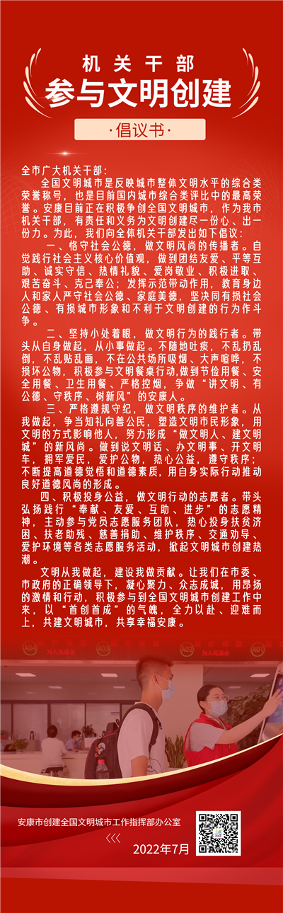 全國文明城市是反映城市整體文明水平的綜合類榮譽稱號,也是目前國內(nèi)城市綜合類評比中的最高榮譽。安康目前正在積極爭創(chuàng)全國文明城市,作為我市機關(guān)干部,有責任和義務(wù)為文明創(chuàng)建盡一份心、出一份力。為此,我們向全體機關(guān)干部發(fā)出如下倡議: