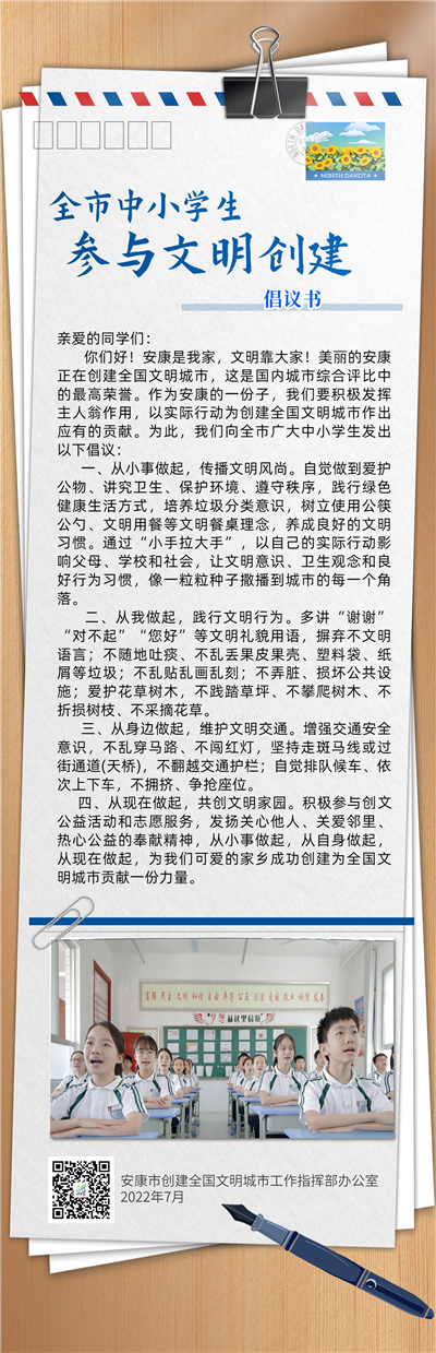 你們好!安康是我家,文明靠大家!美麗的安康正在創(chuàng)建全國文明城市,這是國內(nèi)城市綜合評比中的最高榮譽。作為安康的一份子,我們要積極發(fā)揮主人翁作用,以實際行動為創(chuàng)建全國文明城市作出應有的貢獻。為此,我們向全市廣大中小學生發(fā)出以下倡議: