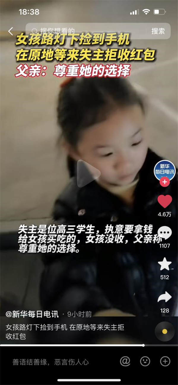 1月28日下午,#女孩撿手機站原地等失主##小姑娘路燈下?lián)斓绞謾C站原地等失主#話題沖上了抖音熱門、微博熱門,廣大網(wǎng)友紛紛點贊。