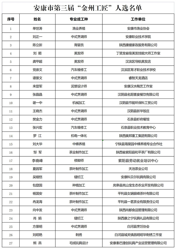 根據(jù)市委組織部、市總工會、市人社局《關(guān)于開展第三屆“金州工匠”評選活動的通知》(安人社函〔2022〕243號)和《安康市“金州工匠”評定辦法》,經(jīng)申報、評審并征求有關(guān)部門意見,擬評選安康市漁業(yè)協(xié)會單世濤等27人為安康市第三屆“金州工匠”,現(xiàn)予公示,公示期自2023年3月28日至2023年4月3日。