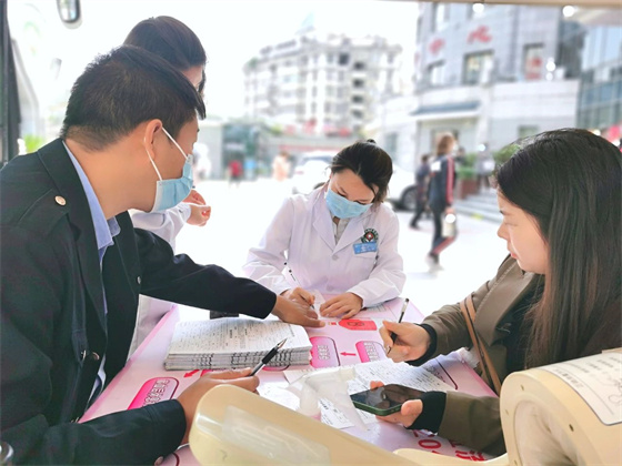 早上9點,列隊等候的醫(yī)務工作者們在獻血車前,井然有序的進行信息登記、健康征詢、血壓測量等程序。他們中有多次獻血的“老兵”,也有首次獻血的年輕職工,有的剛下夜班,有的趁工作間隙,還有的則放棄了休息趕來。大家紛紛表示,無償獻血就是以實際行動踐行廣大醫(yī)護人員的初心使命,為老百姓的生命健康保駕護航。