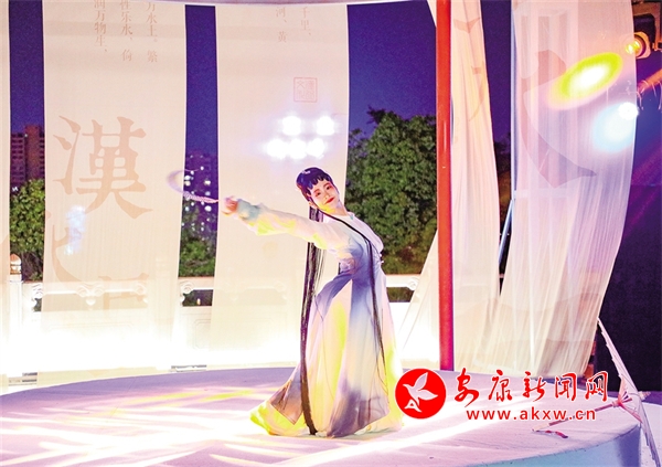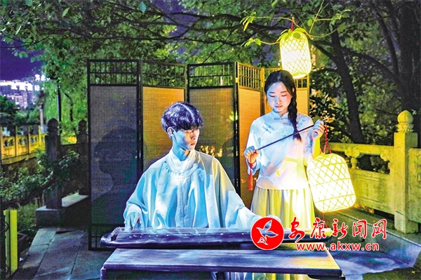 還未走近安瀾樓,就被一首琵琶曲改編的絲竹樂(lè)曲《春江花月夜》吸引,流暢多變的節(jié)奏,巧妙細(xì)膩的配器,絲絲入扣的演奏,仿佛將觀眾帶入那個(gè)月夜春江的迷人景色。環(huán)繞安瀾樓四周,畫(huà)家楊炳昌筆下的金州八景,仿佛一秒穿越古今,勝景徐徐、浮現(xiàn)腦際。