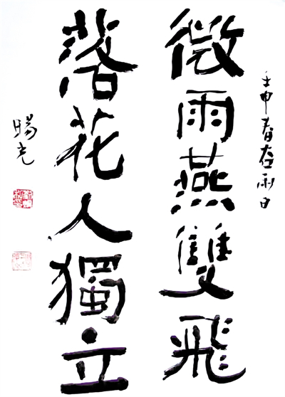 旸光先生淵博的家學(xué),深厚的學(xué)養(yǎng)為其書法技藝開掘出流淌不盡的源泉,正是他那非凡的經(jīng)歷與盤踞胸中的郁勃之氣,鑄就了別具一格的藝術(shù)風(fēng)采??v觀先生書法字里行間的布局、結(jié)構(gòu)、章法,即可以領(lǐng)略其高深的藝術(shù)修養(yǎng)。一般書法家給自己作品題款尚膽怯,更何況給山水畫人物、花鳥畫題款署名,書寫跋語,要求書者不但有深厚的文學(xué)功底賦詞作詩,再根據(jù)畫面的風(fēng)格,畫中所留空白虛實(shí)照應(yīng),用筆用墨的變化去應(yīng)對,好的款跋使作品升華。而先生無論行、草、隸、篆,縱橫涂抹,信手拈來如行云流水,宛若天成,令人折服,先生曾為不少后學(xué)作品撰寫款名,跋語至今記憶猶新。