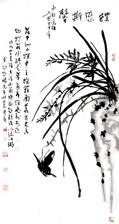 1988年,中國畫壇號稱“蝶王”的王冰如女士,以80歲高齡回到她曾工作生活10年之久的第二故鄉(xiāng)安康舉辦畫展,并且以詩書畫會友,特邀旸光先生和金州著名詩人劉寅初老人同游香溪,冰如老師興之所至,巧繪墨蝶,說道“人言寅初老弟有曹子健七步成詩之才,今日以十步為限,將此畫為題,賦詩一首,旸光老弟書于其上如何?”寅初老只走了三步便道有了,于是順口吟誦,旸光先生揮毫急就“花中仙子蝶中王,蝶舞籣叢花更香,化蝶莊周終是夢,喜看蝶王飛安康?!币还P流暢的行草躍然于畫上,相輔相成,真是詩情畫意天作之合。一幅難遇難得難覓的“三絕圖”誕生了。冰如老師感慨萬千,說到“二位弟臺才高八斗,只可惜待在安康這個(gè)貧瘠的地方被埋沒了也!”這個(gè)場面是一種巧合,正是旸光先生“萬事隨緣”的結(jié)晶,爾后經(jīng)書壇大家陳少默先生為之題跋做款,更是錦上添花,成了四絕圖。冰如、少默、旸光、寅初先生已然作古,這段翰墨丹青之情,將永存世間傳為藝術(shù)佳話。