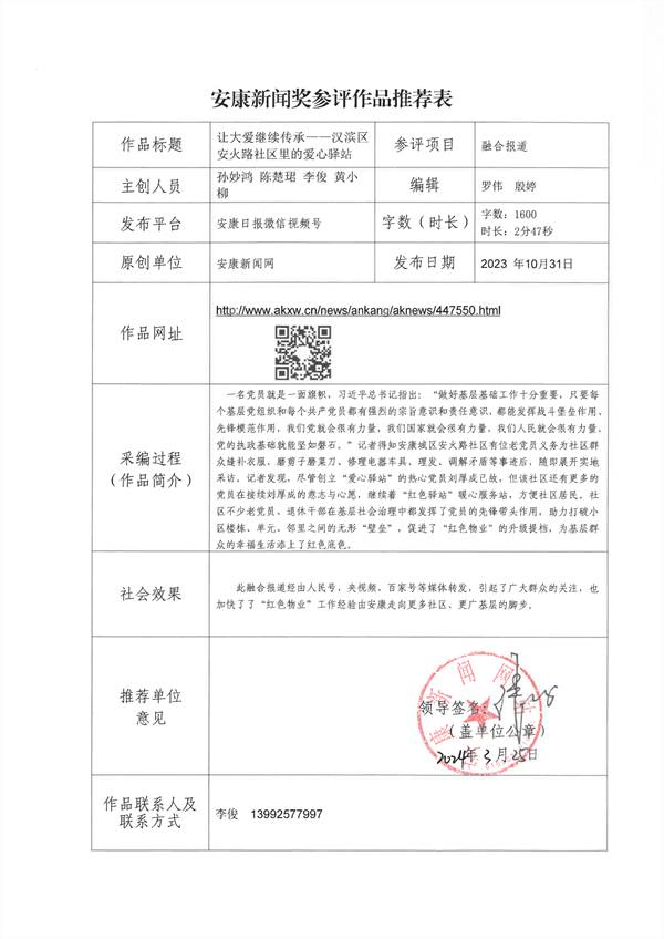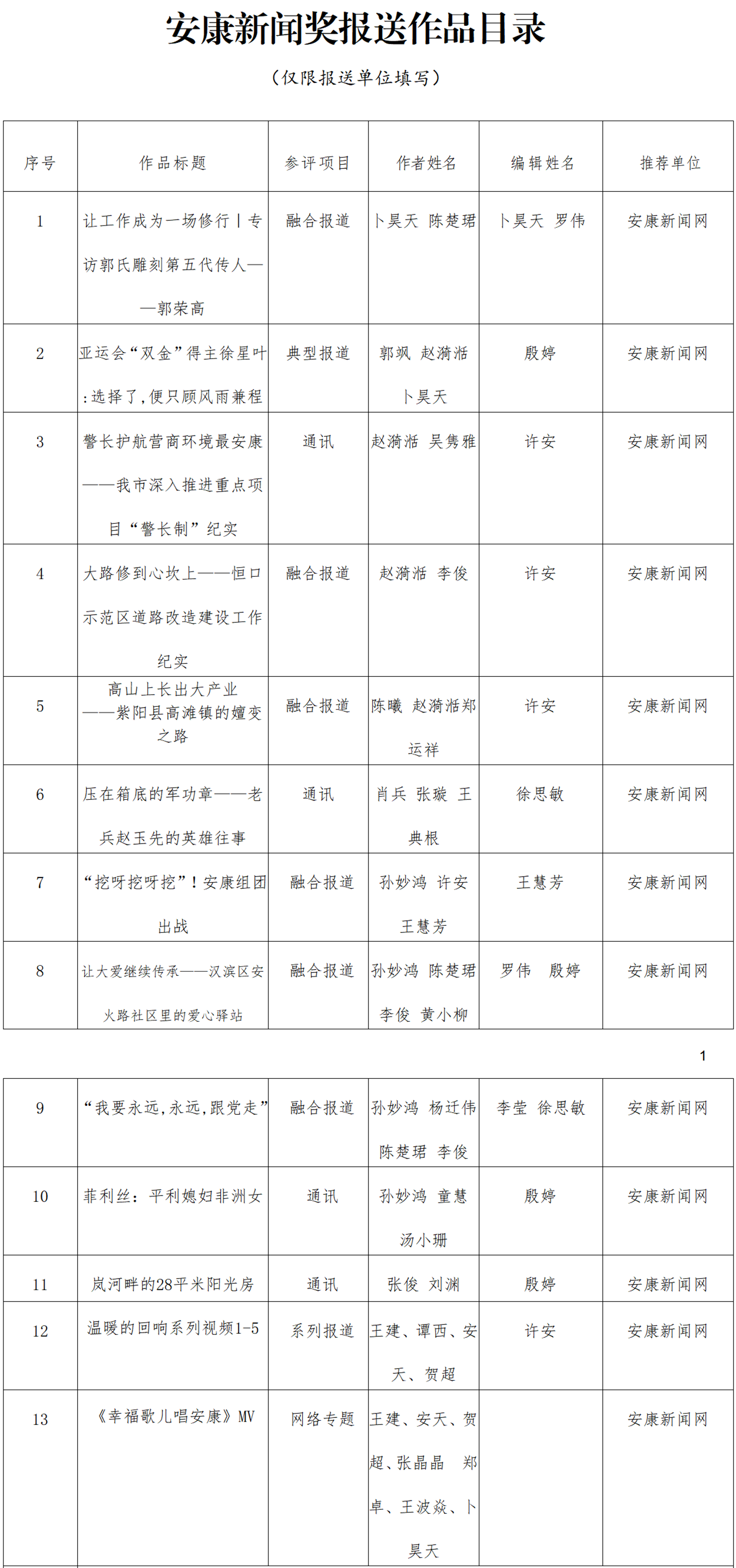 經(jīng)過編委會(huì)推薦、社黨委研究決定,擬推薦以下13件新聞作品參評2023年度“安康新聞獎(jiǎng)”。公示時(shí)間從2024年3月25日至2024年3月29日,公示期為5個(gè)工作日。如有不同意見,請向安康日報(bào)社機(jī)關(guān)紀(jì)委、新聞管理部反映。