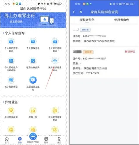 在“服務(wù)”菜單界面,點(diǎn)擊進(jìn)入“家庭共濟(jì)綁定查詢”頁(yè)面,可以查詢授權(quán)者和使用者的角色信息。