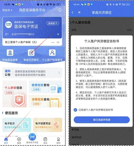 進(jìn)入陜西醫(yī)保APP后,在首頁(yè)菜單中,選擇“家庭共濟(jì)綁定”,進(jìn)入頁(yè)面后仔細(xì)閱讀告知書(shū)內(nèi)容,閱讀完成后勾選“已閱讀個(gè)人賬戶共濟(jì)綁定告知書(shū)”,點(diǎn)擊“我已閱讀并同意”按鈕,進(jìn)入家庭共濟(jì)信息填寫(xiě)頁(yè)面。