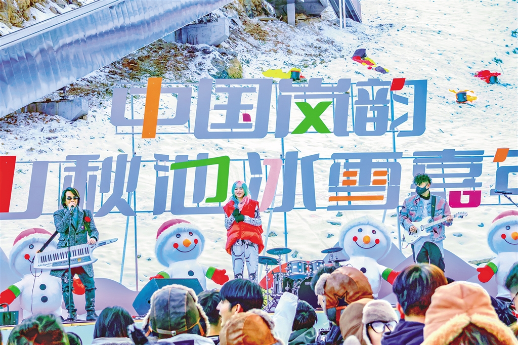 在白雪皚皚與瑤林玉樹交相輝映的雪景勝地,演歌會在唯美動人的開場舞《冰雪奇緣》中拉開帷幕。主舞臺上,勝三分樂隊率先登場,伴隨著強烈節(jié)奏的鼓點與電吉他,為觀眾帶來了《你要跳舞嗎》等經(jīng)典歌曲炒熱現(xiàn)場氣氛。嫂子樂隊作為一支全女子樂隊當仁不讓火力全開,《愛的初體驗》《別問我什么是迪斯科》等動感樂曲徹底點燃觀眾的激情。來自中國臺灣的飛兒樂團重磅登場,為大家?guī)砟捴巳丝诘牧餍忻段覀兊膼邸贰肚曛畱佟贰禠ydia》等歌曲,在現(xiàn)場氛圍的帶動下,游客紛紛揮舞著手中的氣球跟唱,并自發(fā)組成游行隊伍,在冰天雪地中放肆歡笑玩樂。演歌會期間還穿插了舞蹈《雪花芬芬》《魅力四射》、小丑表演《金蛇送福》等精彩節(jié)目。