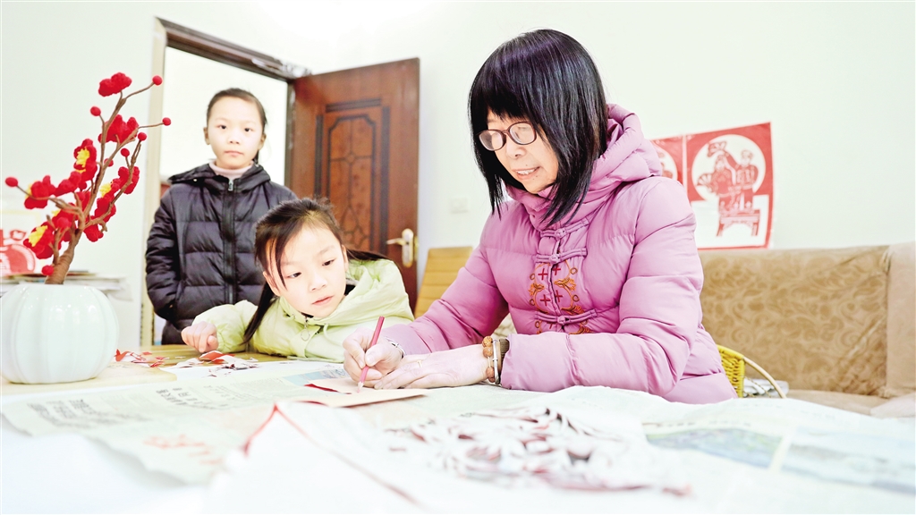 馮增慧教兩個孫女學(xué)剪紙 羅妍 攝?