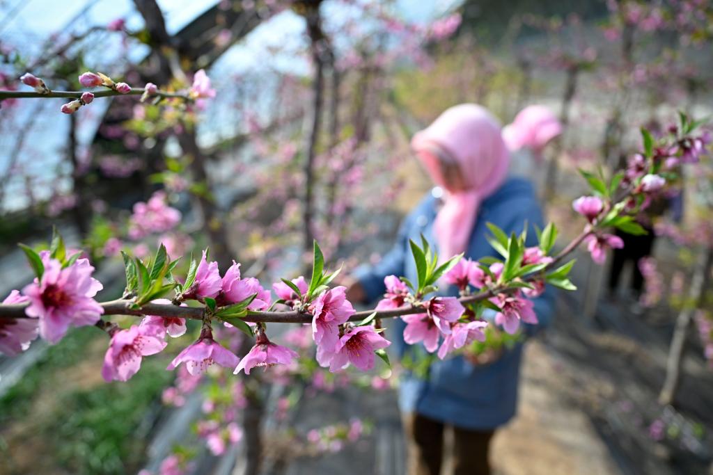 2月24日,在云南省文山壯族苗族自治州文山市馬塘鎮(zhèn)珍珠蜜桃基地,農(nóng)民辛勤護(hù)理桃花。春回大地,各地?fù)屪マr(nóng)時(shí),田間地頭一片繁忙勞作的景象。新華社發(fā)(熊平祥攝)