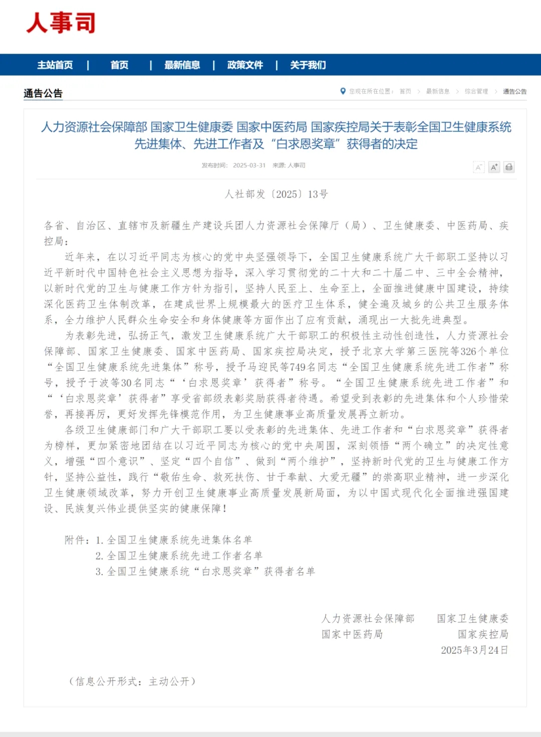 近日,人力資源社會保障部、 國家衛(wèi)生健康委等四部委發(fā)布關(guān)于表彰全國衛(wèi)生健康系統(tǒng)先進集體、先進工作者及“白求恩獎?wù)隆鲍@得者的決定,我市1個集體、1人分別獲得全國衛(wèi)生健康系統(tǒng)先進集體、全國衛(wèi)生健康系統(tǒng)先進工作者榮譽稱號。