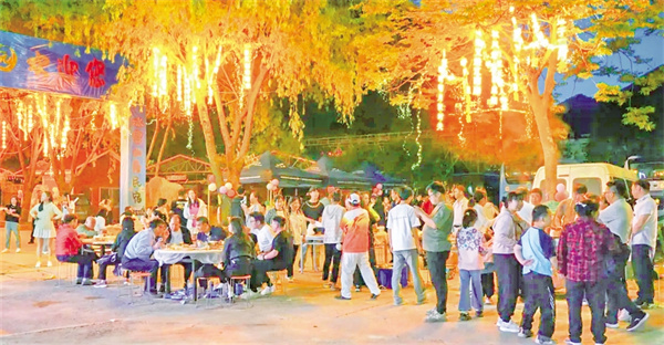 活動現(xiàn)場,本土樂隊、游客與特邀嘉賓輪番登臺,民謠、搖滾、電子樂交織回蕩。游客們圍著篝火載歌載舞,火光映紅張張笑臉?,F(xiàn)場設置的文創(chuàng)產(chǎn)品和小龍蝦、燒烤等特色美食攤位更是滿足了游客的多重體驗。