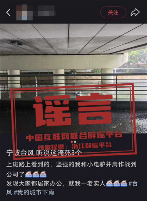 真相:7月30日9時(shí)許,某社交平臺(tái)網(wǎng)民沈某(女,23歲,寧波鄞州人)發(fā)帖造謠稱“寧波一涵洞內(nèi)車輛被淹,有3人淹死”。經(jīng)核查,該內(nèi)容系謠言,目前公安機(jī)關(guān)已對(duì)沈某依法予以批評(píng)教育,該帖文現(xiàn)已刪除。