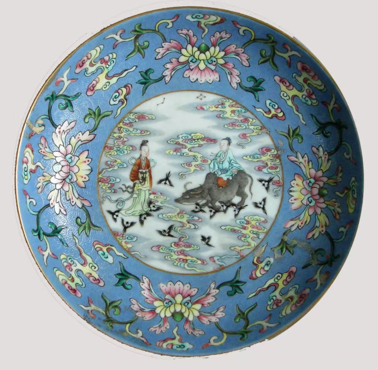 北京藝術博物館收藏的清代景德鎮(zhèn)官窯粉彩人物圖盤,就像一幅流動的七夕畫卷。此盤工藝精湛,口沿涂金,熠熠生輝,盡顯皇家氣派。盤內(nèi)外壁采用“粉彩軋道”工藝,天藍釉地上淺淺的卷草紋似微風輕拂,粉彩花卉與朵云紋相互映襯,如夢如幻。盤內(nèi)底描金圓形開光處,粉彩繪就的人物故事圖案更為生動:牛郎坐于牛背,手握韁繩,深情凝望;織女身姿婀娜,嬌羞回望,二人似在互訴衷腸。背景中祥云繚繞、星辰閃爍、鵲鳥紛飛,為這場相會營造了浪漫的氛圍。外底“鵲橋仙渡”四字,點明主題。