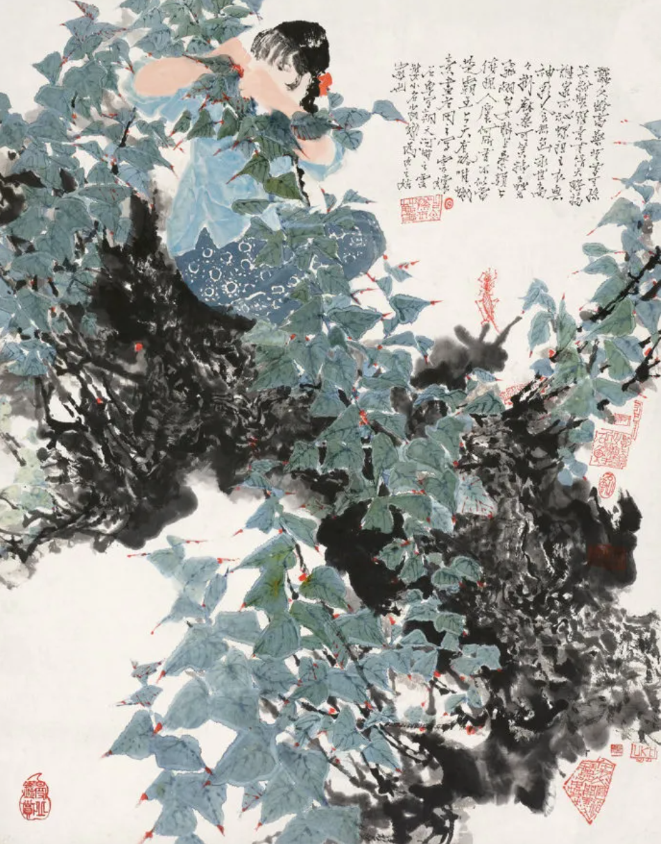題識:蠶女齡喬桑,昔有王孫笑粉妝。羅素有情天降福,誰家不秘王祖。衣無神采食無魚,永世商裔掛麻桑。可笑棉蟲無飛翅,白女敢上桑顛上。俯視人寰何所有,不似當(年)楚霸王。上天有路唯蛾素,畫者因之寫云。石魯寫朝天河畔之云婆,小名安蛾,為女之姑家也?!恫缮D》,2010春拍成交價1064萬元。