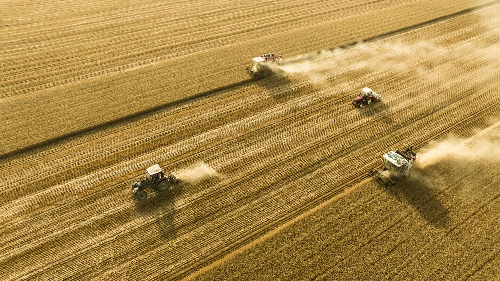 2025年6月4日,在河南省商丘市梁園區(qū)李莊鎮(zhèn)潘堂村志誠種植農(nóng)民專業(yè)合作社,農(nóng)機(jī)手操作機(jī)械在農(nóng)田作業(yè)(無人機(jī)照片)。新華社發(fā)(李恒 攝)