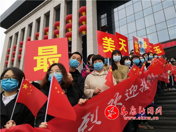 座談會溫馨、簡短,走出會議中心,歡迎英雄歸來的隊(duì)伍仍等在原地,他們揮動著旗子,喊著口號,急切地將援鄂英雄們擁到人群中間,讓相機(jī)定格這勝利、喜悅的一刻。