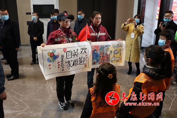 在高新國際會議中心大門入口的臺階上,三所市級醫(yī)院的醫(yī)護(hù)人員、市民群眾列起長隊(duì),喊著口號,夾道歡迎英雄回家。進(jìn)入大廳,孩子們紛紛獻(xiàn)上自己的畫作,表達(dá)對援鄂英雄的敬意。