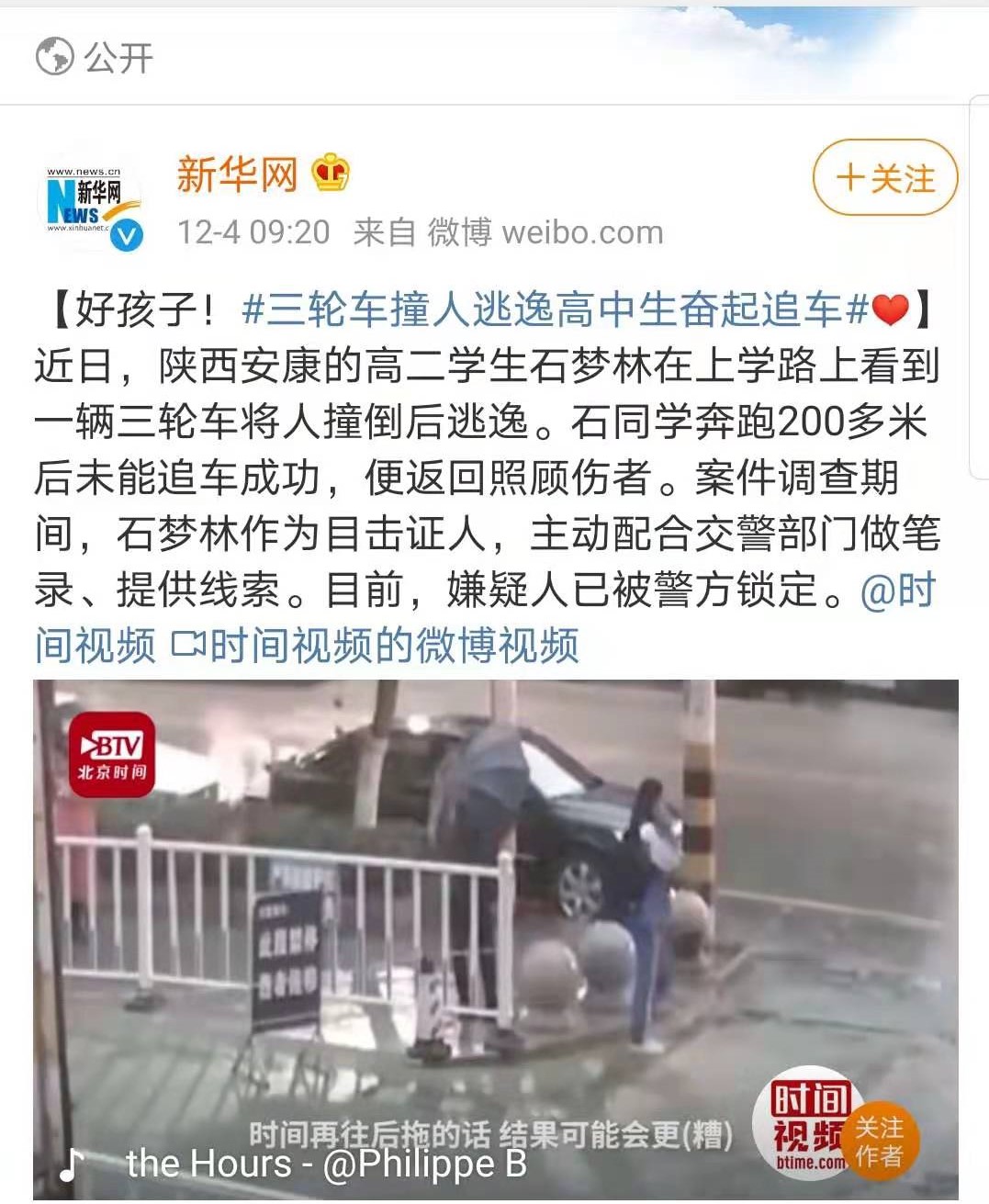 11月23日早上6:50分左右,安康市第二中學(xué)高二學(xué)生石夢(mèng)林在去往學(xué)校途中,看到一輛疾馳的三輪車將一人撞倒在地,司機(jī)徑直離去。石夢(mèng)林毫不猶豫追向肇事車,奮力追逐二百余米后,未能阻攔成功。眼見追不上肇事車輛,他又立即返回,報(bào)警妥善安置傷者后才回到學(xué)校上課。在案件調(diào)查期間,石夢(mèng)林作為目擊證人,主動(dòng)配合交警部門做筆錄、提供線索。目前,該案嫌疑人已經(jīng)鎖定。