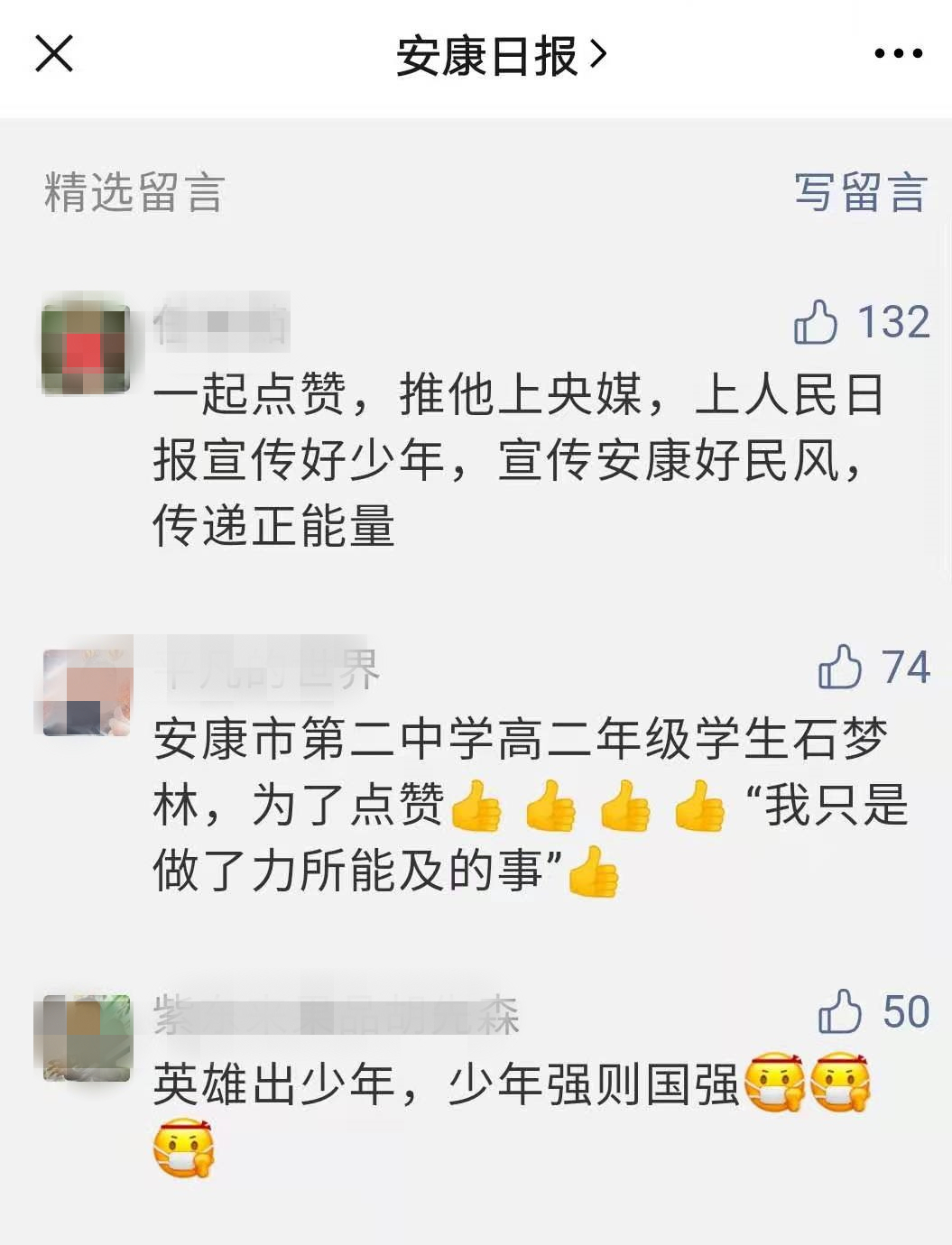 還有網(wǎng)友留言稱,“推他上央媒,上人民日?qǐng)?bào)宣傳好少年,宣傳安康好民風(fēng),傳遞正能量”,@這位網(wǎng)友,你的愿望實(shí)現(xiàn)啦!