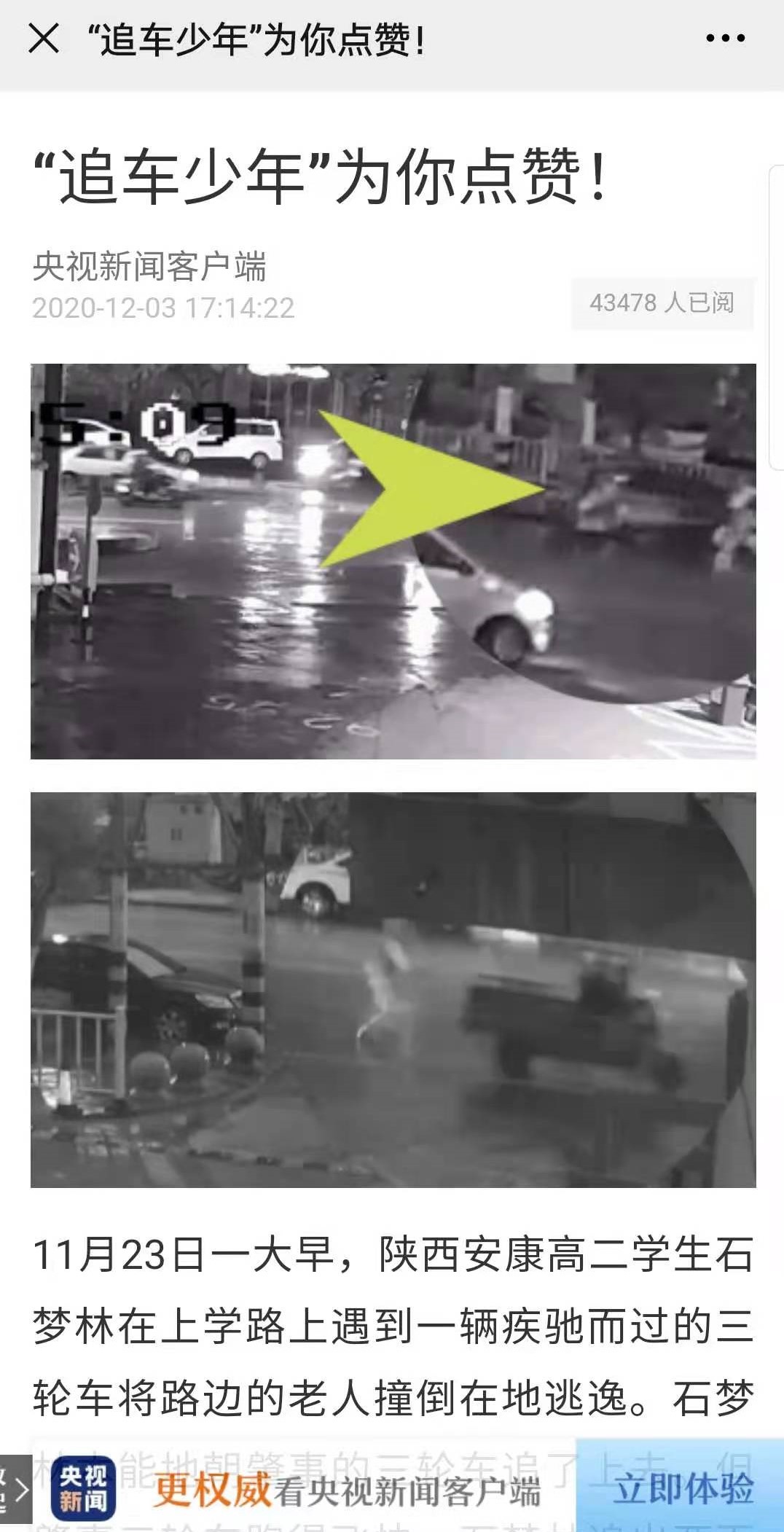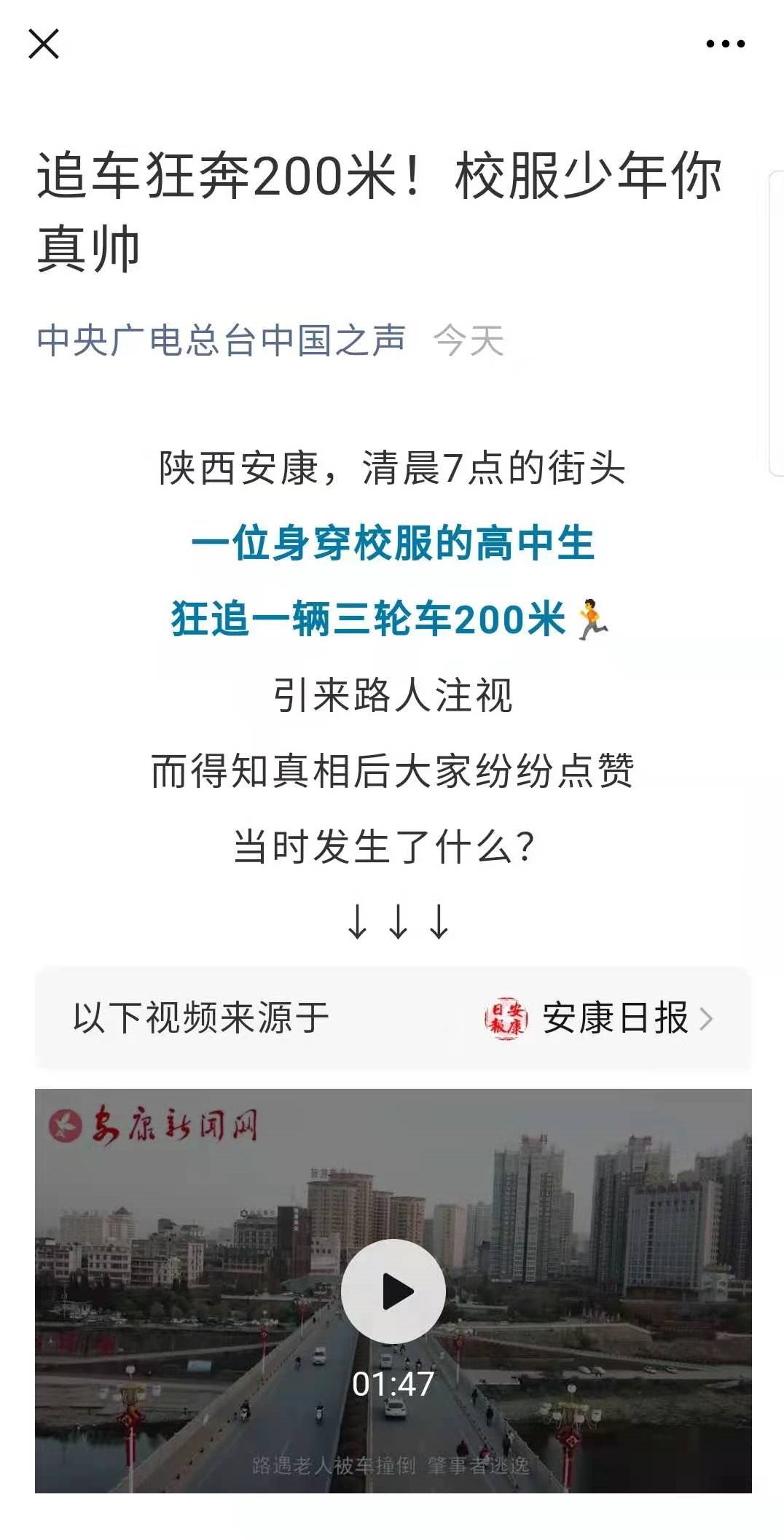 新聞鏈接:奮勇追攔肇事車 緊急救助受傷者 安康學(xué)子見義勇為顯擔(dān)當(dāng)