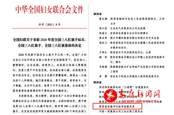 本網(wǎng)訊(通訊員 李倩)“三八”國際勞動婦女節(jié)前夕,全國婦聯(lián)表彰了一批全國三八紅旗手標(biāo)兵、全國三八紅旗手和三八紅旗集體。安康市行政審批服務(wù)局榜上有名,作為全省六個、全市唯一的單位,榮獲“全國三八紅旗集體”榮譽(yù)稱號。