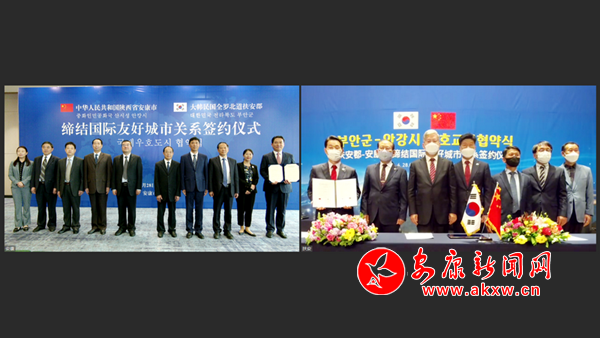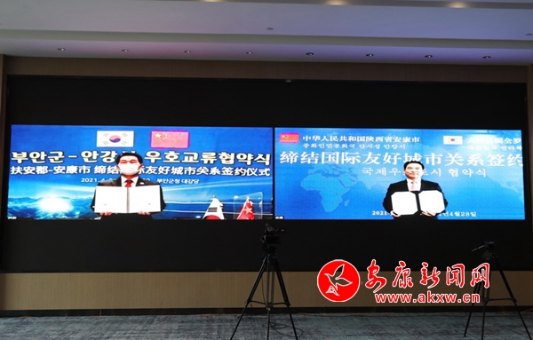 本網(wǎng)訊(記者 艾蓓 通訊員 梁石)4月28日,“中華人民共和國陜西省安康市和大韓民國全羅北道扶安郡締結國際友好城市關系簽約儀式”通過互聯(lián)網(wǎng)線上舉行,兩地正式簽署建立國際友好城市關系協(xié)議書。市長趙俊民、市人大常委會副主任周永鑫、市政府秘書長陳伍文,扶安郡郡守權翼鉉、扶安郡議會議長文燦奇等嘉賓分別在兩地出席簽約儀式,中國駐韓國光州總領事張承剛應邀參加活動。
