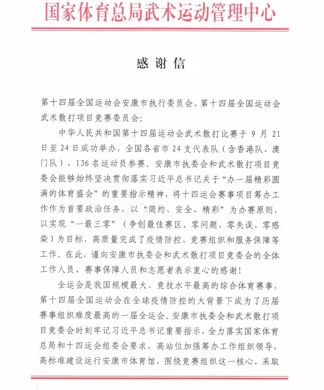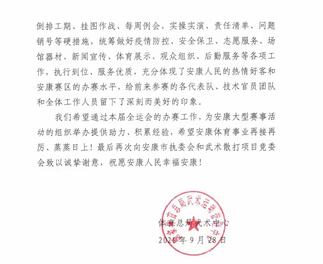 全運(yùn)會是我國規(guī)模最大、競技水平最高的綜合體育賽事,第十四屆全國運(yùn)動會在全球疫情防控的大背景下成為了歷屆賽事組織難度最高的一屆全運(yùn)會。在十四運(yùn)備戰(zhàn)期間,我市克服種種困難,堅持統(tǒng)籌做好疫情防控、安全保衛(wèi)、志愿服務(wù)等各項(xiàng)工作,感謝信中寫道:“安康市執(zhí)委會和武術(shù)散打項(xiàng)目競委會執(zhí)行到位、服務(wù)優(yōu)質(zhì),充分體現(xiàn)了安康人民的熱情好客和安康賽區(qū)的辦賽水平,給前來參賽的各代表隊,技術(shù)官員團(tuán)隊和全體工作人員留下了深刻而美好的印象。”