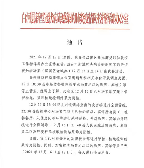 縣疫情防控指揮部辦公室迅速組織相關(guān)單位開展調(diào)查處置。15日18:30縣市場監(jiān)督管理局要求馮某活動的酒店、賓館立即停止營業(yè)。經(jīng)調(diào)查了解,漢濱區(qū)12月15日已對馮某落實集中管控措施,當目核酸檢測結(jié)果為陰性。
