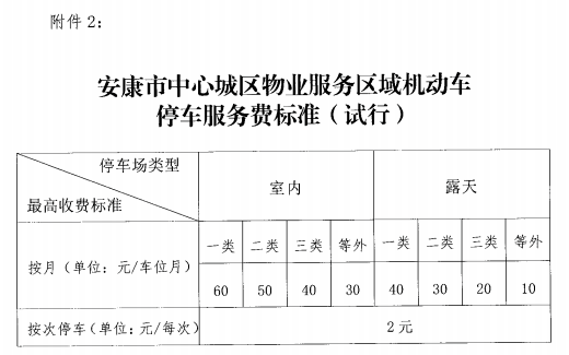2、《安康市中心城區(qū)物業(yè)服務(wù)區(qū)域機(jī)動(dòng)車停車服務(wù)費(fèi)標(biāo)準(zhǔn)》(試行)。