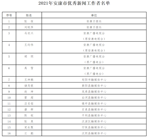 擬授予張俊等16名同志“安康市優(yōu)秀新聞工作者”榮譽稱號。