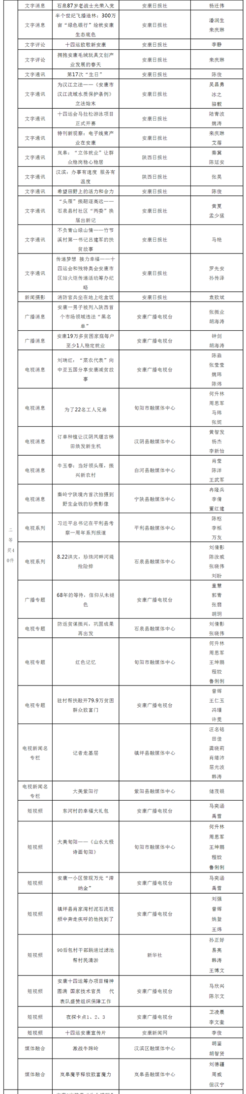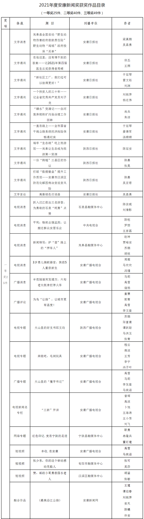 2021年度安康新聞獎評審工作在中共安康市委宣傳部的指導(dǎo)下,由市記協(xié)具體組織實施,經(jīng)過各申報單位推薦,市記協(xié)初審、復(fù)審并組織專家定評,評選出擬獲安康新聞獎作品114件,其中一等獎25件、二等獎40件、三等獎49件。