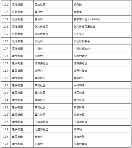 共設(shè)置120個(gè)采樣點(diǎn)(見附件),由4個(gè)街道辦事處統(tǒng)一安排采樣點(diǎn)設(shè)置、人員組織、秩序維護(hù),檢測對象按照街道辦事處要求,分時(shí)段有序到指定地點(diǎn)進(jìn)行采樣,避免人員聚集。