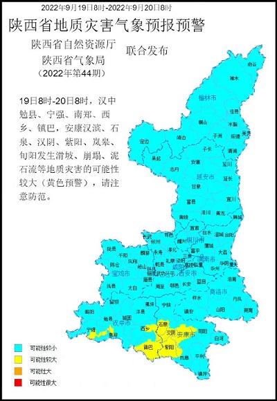 陜西省自然資源廳與陜西省氣象局聯(lián)合發(fā)布地質(zhì)災(zāi)害氣象預(yù)報(bào)預(yù)警:預(yù)計(jì)2022年9月19日8時(shí)至2022年9月20日8時(shí),漢中勉縣、寧強(qiáng)、南鄭、西鄉(xiāng)、鎮(zhèn)巴,安康漢濱、石泉、漢陰、紫陽、嵐皋、旬陽發(fā)生滑坡、崩塌、泥石流等地質(zhì)災(zāi)害的可能性較大(黃色預(yù)警),請注意防范。