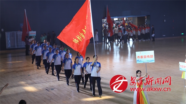 開幕式在暖場節(jié)目《幸福安康》的表演中拉開序幕。伴隨著高昂而優(yōu)美的旋律,儀仗隊隊員護擁著會旗與代表本屆市運會核心主題的標語隊步伐矯健地入場。由全市教育、體育、科技、文化、衛(wèi)生五大領(lǐng)域的杰出代表組成的觀禮團代表從主席臺前走過。緊隨其后的裁判員隊伍、13個青少年組運動員代表團、32 個行業(yè)組運動員代表團闊步入場,展現(xiàn)出朝氣蓬勃的精神風(fēng)貌。入場儀式完畢,全場起立,面向國旗,奏唱中華人民共和國國歌。運動員代表與裁判員分別宣誓。