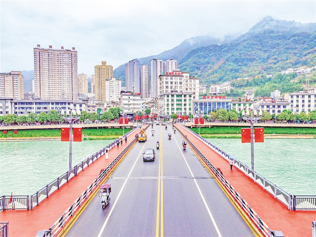 在嵐皋縣大橋兩側,一面面整齊的五星紅旗迎風飄揚,喜迎國慶。