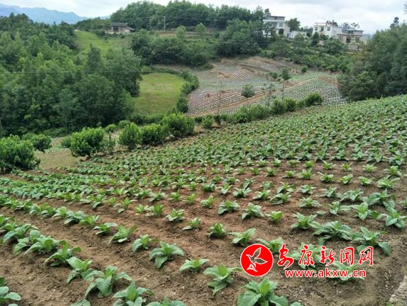 陽春三月,沿著“柏油村道”蜿蜒而上,新栽種的楊梅、車?yán)遄雍丸凌怂纳⒂诘貕K中。牛兒愜意吃草,不遠(yuǎn)處的大棚內(nèi)煙苗吐露新綠,新修的標(biāo)準(zhǔn)化烤煙房排列整齊!