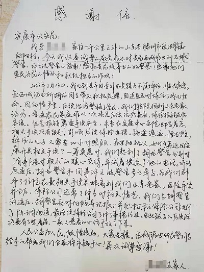 一封信,緊連著警民間的情誼;一頁信紙,書寫著群眾發(fā)自肺腑的感謝。“感謝貴局培養(yǎng)出的好警察,感謝他們愛民為民的情懷和積極擔當?shù)淖黠L……”近日,安康市公安局收到一封來自山東省滕州市濱湖鎮(zhèn)屈先生一家的手寫感謝信,字里行間滿是對安康市公安局漢濱分局西城派出所副所長胡龍及其同事許文波心系群眾、履職盡責、為民解憂的感激之情和贊許之意。