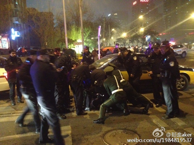 當(dāng)時附近行人很多,該男子先是由西往東走了一小段,“這時候店內(nèi)沖出來了兩名身穿西服的男性工作人員,拿著金屬制品開始追趕該男子,”該男子見狀從兜里掏出了一把長約20公分的水果刀,一邊罵人,一邊越過馬路由東往西跑,兩名男店員在后面緊追不舍。圖為網(wǎng)傳抓捕現(xiàn)場。DGz安康新聞網(wǎng)