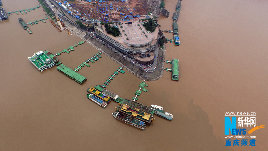 7月1日,今年長江、嘉陵江最大洪峰過境后的重慶朝天門碼頭。 本組圖片由新華網(wǎng)新聞無人機(jī)隊(duì)拍攝