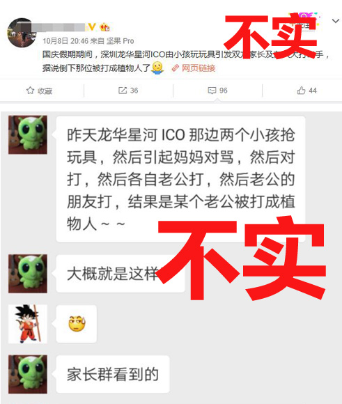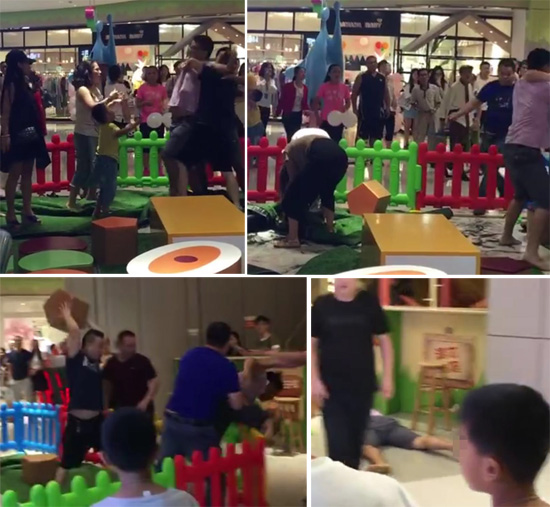 網(wǎng)傳視頻顯示,在一所商場內(nèi)的兒童游樂區(qū)內(nèi),有若干名男子、兩名女子在激烈打斗。另有家長慌忙將孩子帶離區(qū)外,還有工作人員和顧客在驚愕圍觀、勸架。其中一名身穿粉色上衣男子被一名黑衣男子高舉的立方體積木砸倒,俯臥在地,不再動彈。在微博和微信群內(nèi),有人稱打架地點為深圳龍華星河ICO,事情是“兩個孩子搶玩具,引媽媽對罵、對打,然后各自老公打,然后老公朋友打,結(jié)果是某個老公被打成植物人”,引發(fā)網(wǎng)民關(guān)注。一些評論惋惜稱“兩個家庭算廢了”,“沖動是魔鬼”。