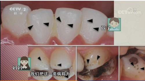 段小紅說:“這個(gè)病例的整個(gè)牙齒顏色接近正常,但細(xì)微觀察,牙齒表面黑色三角指的地方出現(xiàn)一些小的、點(diǎn)窩樣的缺損,這是不正常的,這是孩子的媽媽的情況,從這兩張照片可以看到,小孩牙釉質(zhì)出現(xiàn)的異常是由媽媽這一輩遺傳給他的,我們把這類病稱為遺傳性的釉質(zhì)發(fā)育不全。”