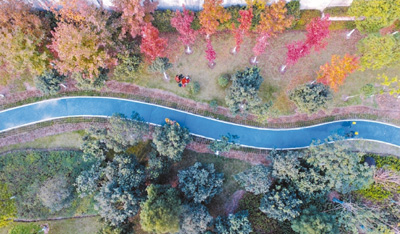 圖為11月27日空中俯瞰新建的“慢行綠道”。為給市民出行營造良好的環(huán)境,國家園林城市——浙江省慈溪市今年9月底在北三環(huán)路兩側開辟出兩條3公里長的“慢行綠道”。該綠道采用生態(tài)透水混凝土,并配以座椅、垃圾桶、照明等設施,綠蔭環(huán)繞滿布花草。近兩年來,浙江省慈溪市積極倡導市民綠色低碳出行,目前該市共建成“慢行綠道”22公里。iNG安康新聞網