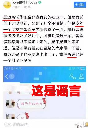 現(xiàn)經(jīng)浦東警方查證,“川沙曹路地區(qū)發(fā)生多起碎尸案”的始發(fā)網(wǎng)民“LOVE男神TFboys”為女中學生張某。其于12月13日晚與同學在網(wǎng)上聊天時得知所謂“華東路附近有個女子被分尸,兇手到現(xiàn)在還沒抓住”的消息,未核實該信息的真實性便在百度貼吧內(nèi)發(fā)布了上述內(nèi)容。后張某感覺被騙,遂于12月15日晚刪除該帖。此后有部分網(wǎng)民將其內(nèi)容截圖發(fā)布至新浪微博,造成該謠言進一步擴散。