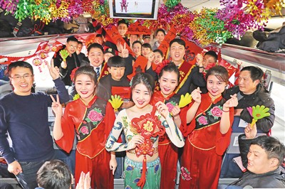 2月8日,是農歷臘月二十三,由沈陽鐵路局集團有限公司沈陽客運段擔當?shù)腉1226次列車上張燈結彩,歡聲笑語,“高鐵聯(lián)歡”正在舉行。本次聯(lián)歡會的7個節(jié)目全部由乘務員們自編自演,包括舞蹈、獨唱、樂器演奏等,高鐵乘務人員還給旅客送上了春聯(lián)和福字,讓旅客們度過一個歡樂祥和的小年。圖為表演人員和旅客一起過小年。(記者 楊青 攝)H8e安康新聞網(wǎng)
