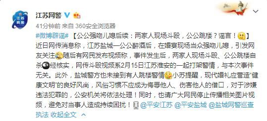 2月26日9時3 3分,江蘇省公安廳網(wǎng)絡(luò)安全保衛(wèi)總隊官方微博“江蘇網(wǎng)警”對此辟謠,“經(jīng)核實(shí),網(wǎng)傳斗毆視頻系2月15日江蘇淮安的一起打架警情,與本次事件無關(guān)。此外,鹽城警方也未接到有人跳樓警情!