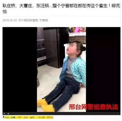 隨后,“父親打女兒”的視頻配上了“某地都在傳這個畜生!曝死他”等標(biāo)題在各地的微信群、自媒體平臺瘋狂傳播,并配文稱視頻內(nèi)的父親是當(dāng)?shù)厝,呼吁?dāng)?shù)厝罕娨黄饘ふ疫@位虐童父親。